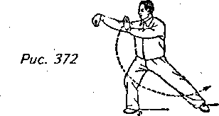 Движение 1 (продолжает рис. 371): Удерживая неподвижной правую ладонь, сжатую в клювообразную форму, перенесите центр тяжести опять на правую ногу, немного поверните верхнюю часть корпуса вправо и выверните вовнутрь левый носок. Одновременно с этим переместите левую руку назад, чтобы она оказалась перед правым предплечьем, а взгляд обратите на нее (рис. 372).