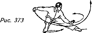 Движение 2: Медленно опустите корпус, припадая на правую ногу и выставляя левую как можно дальше влево, при этом образуется “распростертый” шаг. Проделав это, опустите левую руку к левому бедру и скользящим движением проведите вдоль внутренней стороны правой ноги. Взгляд следит за левой ладонью (рис. 373).