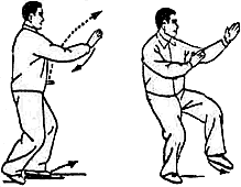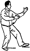 Подшагнуть правой ногой к левой и перенести вес тела на правую ногу, повернув корпус слегка вправо (10–11 часов). При этом левая стопа поднимается и выставляется вперед на пятку. (Выполняется левая “пустая” позиция). Одновременно левая кисть выносится круговым движением до уровня лица ладонью вправо, а правая кисть опускается к внутренней стороне левого локтя ладонью влево. Смотреть на указательный палец левой кисти (рис. 38—40).