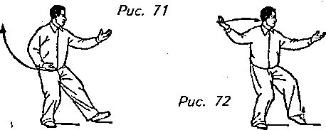 Движение 1 (продолжает рис. 70): Раскройте правую ладонь поверхностью вверх и опустите ее вниз и назад мимо правого бедра, а затем вверх до уровня плеч, сохраняя положение ладони вверх. В это же время поверните левую руку ладонью вниз и передвиньте левую ступню назад, касаясь земли только носком. Взгляд направлен на левую ладонь (рис. 71, 72).