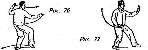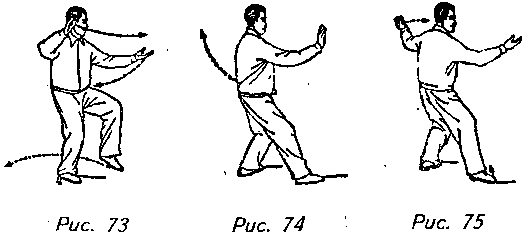 кривой мимо левого бедра, а затем вверх до уровня плеч, держа ладонь развернутой кверху. В это же время левой ногой сделайте шаг назад и перенесите на нее центр тяжести, переходя правой ногой на “свободный шаг”. После чего поверните правую ладонь кверху и посмотрите на нее (рис. 73, 74, 75).