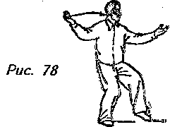Движение 3: Согните левый локоть и вытолкните левую ладонь прямо вперед от своего левого уха с ладонью, отвернутой от вас. Пока левая рука движется вперед, правую нужно перенести вниз и назад по кривой мимо правого бедра, а затем вверх до уровня плеч, держа ладонь кверху. В это же время правой ногой отступите на шаг назад, перенесите на нее центр тяжести; после чего поверните левую ладонь кверху и посмотрите на нее (рис. 76, 77, 78).