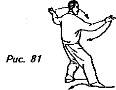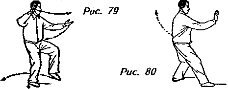 Движение 4: Согните правый локоть и проведите правую руку прямо от правого уха вперед с ладонью, обращенной вперед. Пока правая рука движется вперед, левую нужно перенести вниз и назад по кривой мимо левого бедра, а затем вверх до уровня плеч, держа ладонь кверху. В это же время левой ногой сделайте шаг назад и перенесите на нее центр тяжести, переходя правой ногой на “свободный шаг”. После чего поверните правую ладонь кверху и посмотрите на нее (рис. 79, 80, 81).