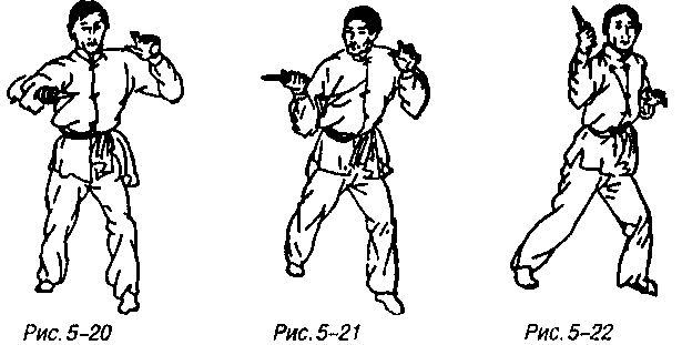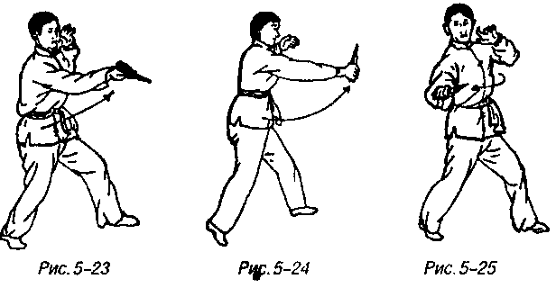 Противник стоит с ногами расставленными вперед и назад, обращенная центром ладони влево правая рука с ножом с острием в качестве точки приложения силы снизу наносит укол вперед- вверх (рис. 5-24).