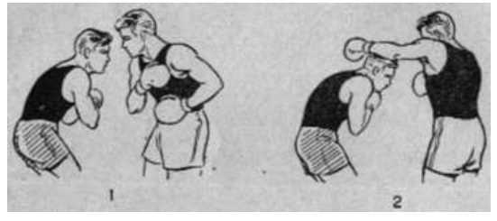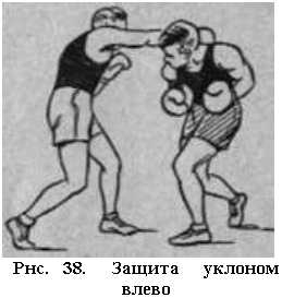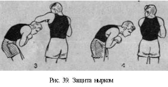 Наиболее просто нырок выполнять без уклона: боксер несколько сгибает ноги, посылая колени вперед и распределив вес тела равномерно на обеих ногах или слегка сместив его на правую ногу, туловище несколько сгибает в верхней части спины, подбородок опускает на грудь. В результате боксер как бы подныривает под удар противника. Такую разновидность нырка можно применять как против ударов сбоку, так и против прямых ударов. Боксер должен избежать опасного движения головой; поэтому ему необходимо не выходить головой за линию носка левой ноги, а выпрямляться после нырка не вперед и вверх, а в сторону, лучше вправо (рис. 39).