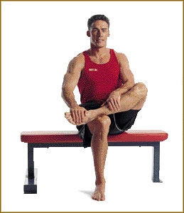 Упражнение: сядьте на скамью, положив лодыжку одной ноги на другую рядом с коленом. Одной рукой захватите левую ногу чуть выше лодыжки. Другой рукой возьмитесь за верхнюю часть стопы, выдохните и медленно потяните стопу на себя. Проделайте то же самое с другой ногой.