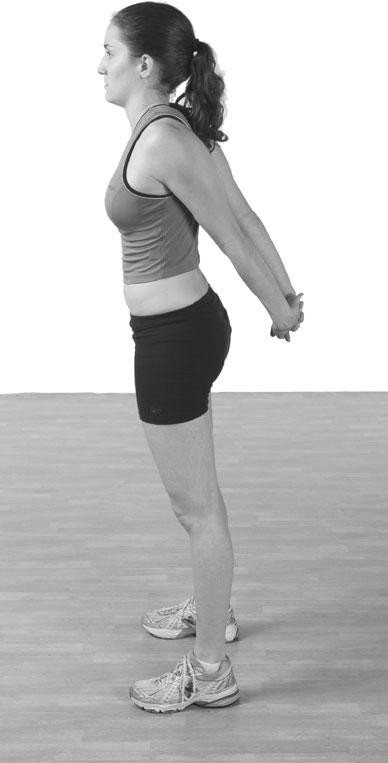 1. Переплетите пальцы за спиной, ладони обращены друг к другу. Сохраняя прямое положение тела и стараясь не сгибать руки в локтях, плавно отведите кисти как можно дальше от спины. Плечи должны быть опущены в ходе всего упражнения. Удерживайте растяжку в течение 10 секунд. Отдохните 30 секунд и повторите.