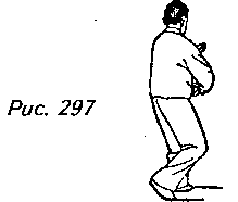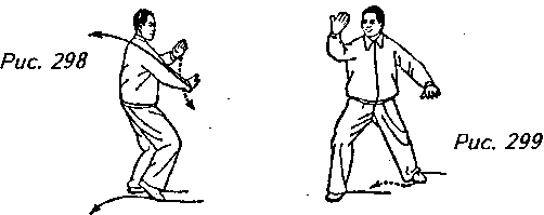 Движение 1 (продолжает рис. 296): Поверните верхнюю часть корпуса немного влево, соедините обе руки в позицию “обхватывание мяча” на уровне груди с левой рукой сверху. В то же время придвиньте правую ступню к левой, касаясь земли носком (рис. 297).