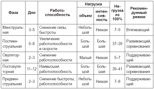 В мезоцикле подготовки целесообразно выделять продолжительные микроциклы с высокой и короткие с пониженной восстанавливающей нагрузкой. Это позволит выполнить общий большой объем интенсивной работы. В таком мезоцикле первые 7 дней, начиная с первого дня менструации при любой продолжительности МЦ, микроцикл должен быть двухфазным: восстановительный со сниженной адаптацией до окончания менструации и повышенной адаптацией после ее окончания. Суммарная нагрузка небольшая: в первой половине техническая подготовка с нагрузкой на верхние конечности, во второй – скоростная работа.