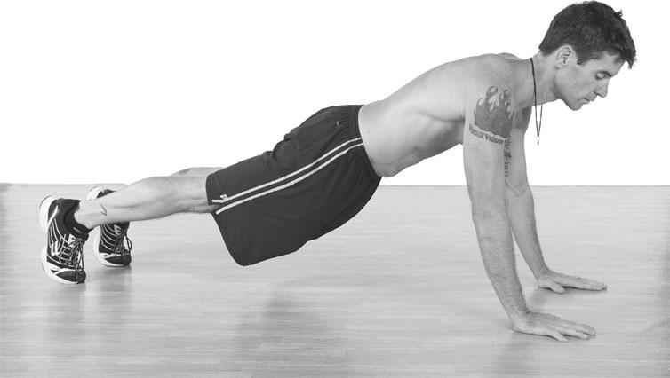 ПОЛОЖЕНИЕ. Поставьте ладони на пол примерно на ширину плеч, пальцы обращены вперед, руки выпрямлены, но локти не выключены. Отступите ногами назад так, чтобы ваше тело образовало одну прямую линию от головы до пяток. Ноги следует развести примерно на 15 сантиметров. Удерживайте вес тела на носках. Напрягите мышцы средней части тела, чтобы избежать провисания спины. Не допускайте провисания в области плеч.