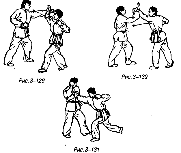 Из позиции для атаки швыряемой ладонью или позиции для разведки дороги рубящей ладонью, когда противник с левой ногой впереди левым кулаком наносит мне прямой удар в лицо, я следуя движению поворачиваюсь влево (поворачивая правое предплечье вокруг своей оси внутрь с краем локтевой кости в качестве точки приложения силы) и вспарывая вверх блокирую вправо руку противника (рис. 3-129).