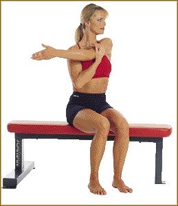 Упражнение: прямая рука поперек тела на уровне плеч. Кисть другой руки положите на «рабочую» руку выше локтя. Выдохните и медленно прижимайте «рабочую» руку к телу. То же для другой руки.