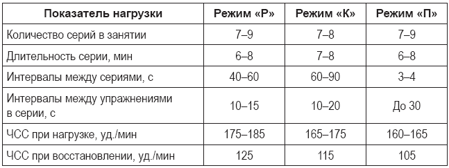 Для полной нагрузки рекомендуется 7 серий, а щадящий режим – 3–4 серии упражнений. Для организации тренировки в режиме «Р» необходима высокая интенсивность упражнений, соревновательный метод. Режим «К» строится с привлечением технико-тактических упражнений и специально-подготовительных средств. В режиме «П» совершенствуется технико-тактическое мастерство.
