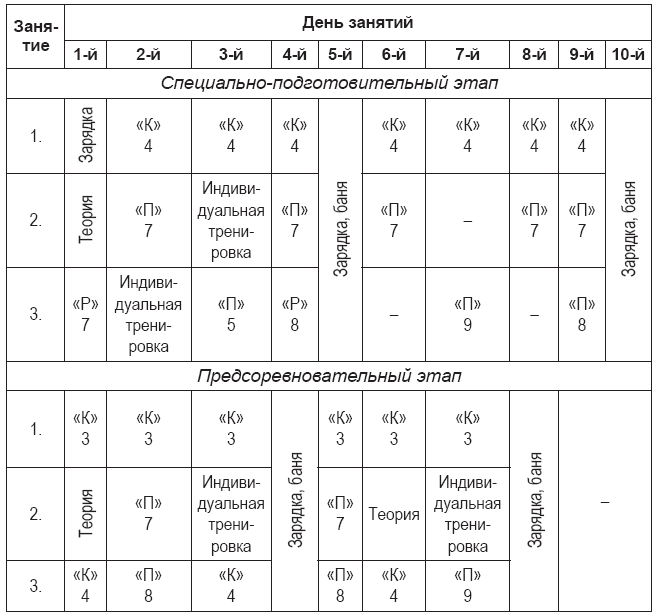 Утренние тренировки нацелены на воспитание физических качеств с укороченным режимом нагрузки по 4 серии, дневные – в поддерживающем режиме технико-тактической направленности. Третья тренировка в первом мезоцикле имеет высокую нагрузку в развивающем режиме, а в предсоревновательном мезоцикле развивающий режим «К» применяется в четырех сериях упражнений.