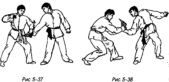 Корпус поворачивается влево, одновременно левая рука поднимаясь выкручивает запястье противника наружу, правая рука через низ идет вверх и влево, нанося осаживающий удар по внешнему ребру ладони противника, сразу же вес тела смещается назад, корпус наклоняется вперед, обе руки перегибают кисть противника в запястье вверх и нажимают вниз (большие пальцы с силой нажимают на тыльную сторону кисти противника)(рис.5-38).