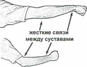 Рука хотя и состоит из различных костей и суставов, но благодаря физическим способностям тела может принимать жесткие сочленения в суставах и собираться в единую жесткую конструкцию. В результате чего рука представляет биомеханическую модель тарана. При жесткой связи кулак и локоть составляют единое целое (рис. 4.9). Они находятся практически на одной линии. Положение локтя жестко регламентирует положение кулака. Таким образом, таранная техника ударов предполагает жесткую связь кулака (или любой другой ударной части) с другими суставами руки.
