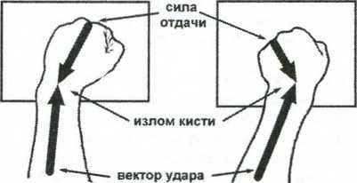 При чрезмерном вложении массы тела в удар возможны различные травмы. Чаще всего это травмы кисти. Нередко возникает ситуация проиллюстрированная на рис. 4.10. Недостаточно прочно сформированный кулак или слабый сустав в момент столкновения с целью приводит к такому векторному распределению сил, в результате которого возникает травма лучезапястного сустава. Общий вектор силы удара, в том числе под действием массы тела, в результате смещения лучезапястного сустава находит выход через лучезапястную кость. Кулак и лучезапястный сустав из-за смещения кулака уже не составляют единую жесткую структуру, но продолжают участвовать в динамике удара. На кулак начинает действовать сила противодействия, возникающая в точке контакта с целью. А так как кулак и лучезапястный сустав уже не в жесткой структуре с остальной рукой, то в результате сложившегося распределения векторов сил происходит смещение сустава.