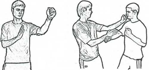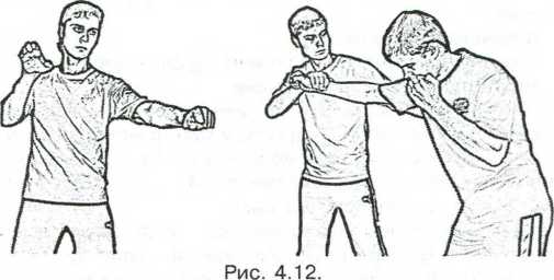 Однако также возможно в рамках стиля использовать и «длинные» таранные удары, что определяется уже спецификой ситуации. Например, часто возникает следующая ситуации - противник наносит удар, боец приводит блок-захват одноименной руки. При этом у противника открывается нижние зоны, куда боец наносит прямой удар (рис. 4.12).