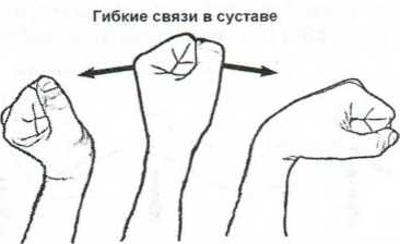 Удар «бросок камня». Другой принципиально иной техникой удара является удар «бросок камня». Этот удар основан на биомеханическом моделировании ударного воздействия в результате броска камня. Кинутый камень, соприкасаясь с целевой поверхностью, не имеет возможности формировать жесткую структуру с опорой на землю. Он лишь отдает накопленную в результате полета кинетическую энергию целевой поверхности и отскакивает от нее. Достаточно кинуть небольшой камень в стену, чтобы проследить вышеописанную механику удара. Биомеханической аналогией камня является, по сути, любая ударная часть руки бойца. Ярче всего аналогией камня может служить кулак. Связь между кулаком и предплечьем может быть, кроме жесткой (как при таранном ударе), также и гибкой (рис. 4.13). Лучезапястный сустав очень подвижен, что создает большое количество возможных ударов. При отсутствии жесткой связи кулак может быть достаточно свободно выброшен в удар. При этой связи положение локтя менее значимо. Кулак и локоть не находятся на одной линии в конечно фазе удара. Удары наносятся от кисти, но с участием локтя, а иногда и плеча.