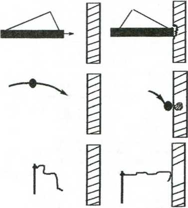 Энергетически-импульсные особенности трех видов ударов можно проиллюстрировать с помощью рис. 4.17. Таранный удар приводит к большим физическим разрушениям, при средней глубине проникновения ударного импульса. Удар «бросок камня» приводит к внутренним физическим разрушениям, с большой глубиной проникновения ударного импульса. Хлыстовой удар приводит к повреждению верхних тканей, ударный импульс сосредоточен на поверхности.