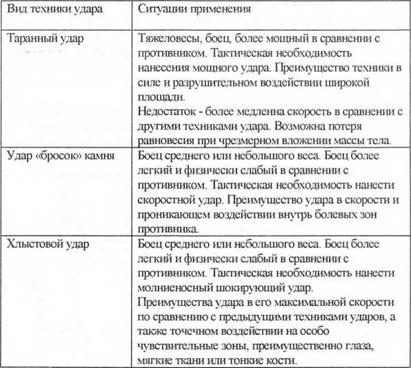 Таблица 4.1. Общая характеристика техник ударов и практические ситуации их использования