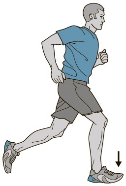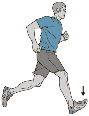 На рисунках 12.4 и 12.5 в двух ракурсах показано, как должна ставиться стопа при беге. На обоих рисунках та, что впереди, должна вот-вот соприкоснуться с землей. И там и там ступни почти параллельны поверхности. На этих рисунках изображено почти идеальное положение стопы; вы не обязательно должны быть настолько же близки к совершенству. Пятка может первой коснуться земли, а может дотронуться и почти одновременно с подушечкой под пальцами. Другими словами, можно ставить ногу на заднюю часть стопы, но при касании пяткой земли передняя часть должна быть не более чем в двух сантиметрах от поверхности.