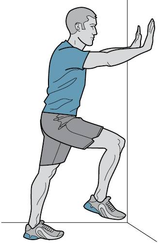 Первое упражнение очень простое. Встаньте лицом к стене на расстоянии примерно 50 см. Положите ладони на стену, слегка опираясь. Теперь оторвите правую ногу от пола, как будто делаете движение в беге, и уроните ее на пол (рис. 12.8). Она должна приземлиться перед левой, а не рядом. Повторите это движение несколько раз с обеими ногами. Внимательно изучите, что происходит со ступнями и коленями. Обратите внимание, что стена не позволяет вытянуть правую ногу вперед настолько сильно, чтобы поставить ее на пятку. Когда нога оторвана от поверхности, колено сильно согнуто и стопа прямо под коленом, не впереди. Такое положение ноги и стопы зафиксировано рис. 12.4 и 12.5. Именно выхлест голени вперед заставляет ставить ногу на пятку, это очень хорошо заметно на рис. 12.7.