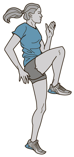 Выполните еще одно упражнение – «Подскоки» (позже объедините его с «Пробегами»). Этот прием, скорее всего, знаком вам с детства, ведь все ребята скачут, когда им весело. Но, в отличие от малышей, у которых это получается само собой, вам понадобится некоторое время, чтобы снова наработать это движение. Просто последний раз, видимо, вы скакали довольно давно. Но это время, безусловно, стоит потратить. Подскоки научат вас ставить ногу плоско и четко под коленом, при этом не нужно смотреть на ноги. Некоторые спортсмены так делают во время упражнения «Пробеги». Однако если поначалу здесь нет ничего плохого, в итоге стоит этого сторониться. На рисунке 12.9 показано, как делать подскоки. Это фактически прыжки на одной ноге при поднятой второй. Ноги стоит чередовать после каждого подскока. Делайте это упражнение примерно 20 секунд после «Пробеги», перед тем как вернуться в исходную точку.
