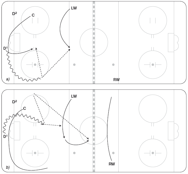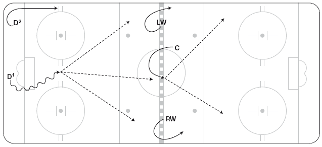 D1 в течение нескольких секунд находится в ожидании за воротами. Все трое нападающих держатся поодаль в нейтральной зоне. D2 страхует D1, свободно перемещаясь в одном из углов. D1 выходит на передний план и делает пас C, который кружит в центре площадки, LW или RW, которые перемещаются или занимают определенную позицию (неподвижную позицию вдоль бортов у одной из линий). Если центрального нападающего C при получении шайбы прессингуют, он может совершить бросок от борта и заставить LW или RW пуститься за ней вдогонку (рисунок 1.13).