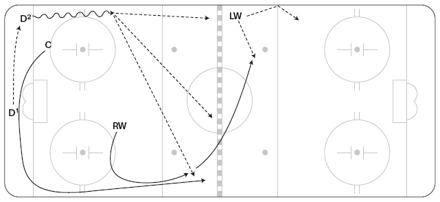 D1 позади ворот ожидает, когда C развернется. C может развернуться позади ворот или заехать в дальний угол. RW разворачивается на том же фланге, но несколько ближе к центру площадки, чем C. D2 находится в ожидании в самом углу. D1 тут же делает передачу D2, у которого тогда по мере перемещения к центру площадки открываются три варианта: (1) выполнить пас LW, а тот может сделать пас или передать шайбу по направлению к RW, пересекающему центр площадки; (2) отдать пас RW; (3) осуществить передачу через центр на дальний фланг. Ведущими игроками являются RW и C, поскольку они перемещаются на скорости, чтобы пробиться сквозь «ловушку» (рисунок 1.12).