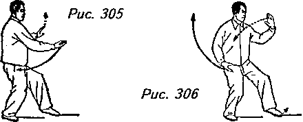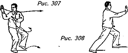 Движение 2: Поверните верхнюю часть тела влево, сделайте левой ногой шаг вперед и влево и перенесите на нее центр тяжести, переходя на левый "шаг вдоль кромки радуги”. Одновременно с этим передвиньте правую руку обратно и вытолкните вперед от правого уха, удерживая кисть на уровне носа, ладонь обращена наружу. Дайте левой руке опуститься до левого колена, круговым движением “почистите” его, доводя ладонь до левого бедра. Взгляд теперь направлен в сторону пальцев правой руки (рис. 308).
