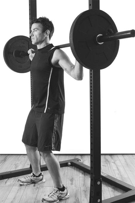 1. Встаньте под штангу так, чтобы гриф удобно лег на плечи за головой (см. «Использовать ли подушки для грифа?», с. 139). Примите устойчивое положение и возьмите гриф прямым хватом так, чтобы руки были разведены на расстояние, превышающее ширину плеч на 15–20 сантиметров. Чтобы встать под штангу, немного согните ноги в коленях и разведите их примерно на ширину плеч. Чтобы снять штангу со стойки, выпрямите ноги и осторожно сделайте шаг вперед. Выпрямитесь, отведите плечи назад (грудь должна быть максимально расправленной). Держите голову прямо, поднимите подбородок, смотрите прямо перед собой. Сделайте глубокий вдох и напрягите мышцы брюшного пресса, чтобы стабилизировать среднюю часть тела и защитить спину в то время, когда будете приседать.