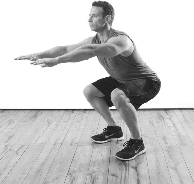 ПРИСЕДАНИЕ С ВЕСОМ СОБСТВЕННОГО ТЕЛА. Чтобы выполнить базовое приседание без отягощения, встаньте прямо, расправьте грудь, поднимите подбородок, смотрите прямо перед собой, сохраняйте естественный изгиб поясницы. В ходе всего упражнения не сгибайте спину; голова и грудь должны оставаться в положении, близком к вертикальному. Разведите ноги примерно на ширину плеч, носки можно развести на 45 градусов. Приседание выполняется так же, как со штангой, но в данном случае руки следует держать перед собой параллельно полу.