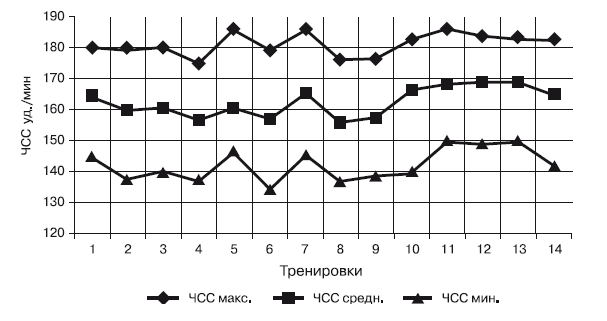 Анализируя ЧСС при выполнении скоростно-силовой работы (рис. 18), можно отметить следующее: минимальная ЧСС после первых трех тренировок уменьшилась; следующие четыре тренировки она изменялась гетерохромно, увеличиваясь и уменьшаясь через тренировку; следующие три тренировки она незначительно повышалась, затем оставалась на одном уровне и следом резко уменьшилась. Минимальная ЧСС характеризует нижнюю адаптационную границу, которая показывает, насколько организм приспособился к данной нагрузке. На последних трех тренировках видно, что организм адаптировался к заданным условиям, а последнее занятие демонстрирует, что данная нагрузка исчерпала свой адаптационный резерв и надо переходить к следующему этапу тренировки. Средняя минимальная ЧСС за тренировочный период составила 142,1 уд./мин.