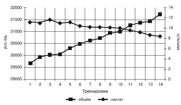 Рассмотрим показатели объема и лактата крови (рис. 19) при выполнении скоростно-силового комплекса в аэробно-анаэробном режиме. Из рисунка видно, что объем выполненной работы увеличивался каждую тренировку, что позволило постепенно и последовательно усиливать воздействие на адаптационные механизмы спортсменов, и к концу тренировочного цикла он увеличился в 7 %. В то же время видно, что показатели лактата почти каждую тренировку незначительно снижались, что свидетельствует о хорошем адаптационном воздействии предложенной аэробно-анаэробной нагрузки. Если в начале тренировочного этапа лактат крови после тренировки был 11,3 ммоль/л, что является границей гликолитического механизма энергообеспечения, то в конце аэробно-анаэробного цикла подготовки он составил 8,5 ммоль/л, что соответствует смешанному энергетическому метаболизму.