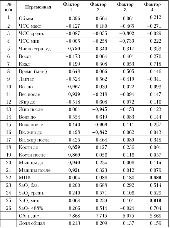 Четвертая компонента объясняет 16 % суммарной дисперсии. Высокая нагрузка в переменных, характеризующих расход ккал: имеется максимальное потребление кислорода, минимальная и <88 % сатурация кислорода. Учитывая положительное и отрицательное воздействие переменных на эту компоненту, ее можно интерпретировать как фактор перехода энергообеспечения с аэробного на анаэробный. Результаты факторного анализа скоростно-силовой подготовки показали, что улучшение аэробноанаэробного компонента выносливости происходит за счет хорошего состояния сердечно-сосудистой системы и адаптации к недостатку кислорода.