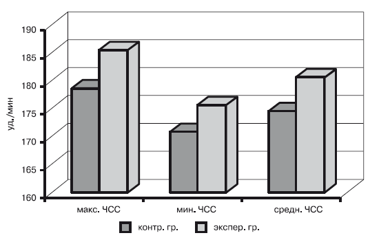 Анализируя показатели, характеризующие воздействие аэробно-анаэробной выносливости на сердечно-сосудистую систему дзюдоистов в экспериментальной и контрольной группах, можно отметить следующее (рис. 20). Максимальная ЧСС в контрольной группе была 178,5 уд./мин, а в экспериментальной беговая и прыжковая тренировка повысили ее до 185,4 уд./мин, что на 4 % выше. Минимальная ЧСС в контрольной группе составила 170,5 уд./мин, а в экспериментальной – 175,6 уд./мин, что на 3 % выше. Соответственно, средняя ЧСС также была выше в экспериментальной группе (180,5 уд./мин), чем в контрольной (174,5 уд./мин). Таким образом, можно констатировать, что беговая и прыжковая нагрузки оказывает на организм спортсменов более существенное влияние, чем бросковая тренировка.