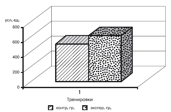 Анализируя объем выполненной работы после применения беговой + прыжковой подготовки и бросковой тренировки (рис. 21), можно отметить, что за ограниченный временной режим в 35 мин дзюдоисты экспериментальной группы освоили объем в 602 усл. ед., а спортсмены контрольной группы, выполняющие броски через спину с захватом руки на плечо, – 497 усл. ед., что на 21,1 % меньше. Можно констатировать, что беговая и прыжковая нагрузки оказывают на организм спортсменов более интенсивное воздействие и позволяют выполнять больший объем работы, что существенно сказывается на адаптационных способностях дзюдоистов, развивая аэробно-анаэробные возможности.