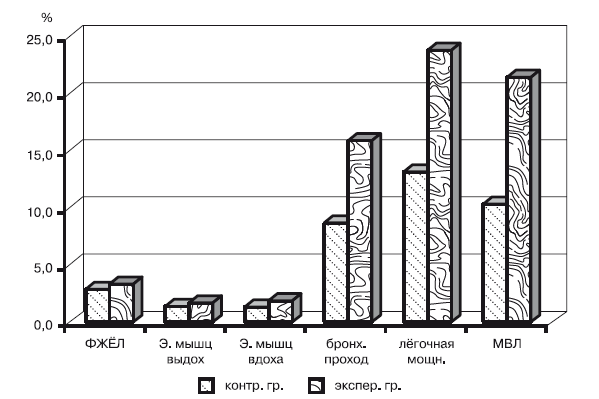 После беговой + прыжковой нагрузки увеличились форсированная жизненная емкость легких на 3,3 %, бронхиальная проходимость – на 15,8 %, эффективность вдоха – на 1,8 %, выдоха – на 1,6 %, легочная мощность – на 23,8 %, максимальная вентиляция легких – на 21,5 %. При бросковых тренировках жизненная емкость легких увеличилась на 2,8 %, бронхиальная проходимость – на 8,7 %, эффективность вдоха – на 1,3 %, выдоха – на 1,4 %, легочная мощность – на 13,2 %, максимальная вентиляция легких – на 10,4 %. Следовательно, в экспериментальной группе форсированная жизненная емкость легких улучшилась на 0,5 % (р>0,05), бронхиальная проходимость – на 7,1 % (р<0,05), сила мышц вдоха – на 0,5 % (р>0,05), выдоха – на 0,2 % (р>0,05), легочная мощность – на 10,6 % (р<0,05), максимальная вентиляция легких – на 11,1 % (р<0,05). Таким образом, на дыхательную систему организма спортсменов беговая + прыжковая тренировка оказывала более существенное воздействие, чем бросковая.