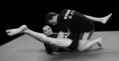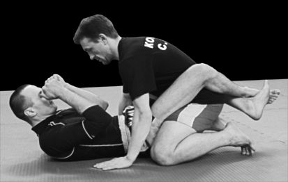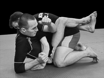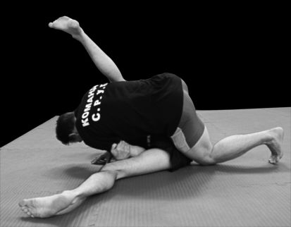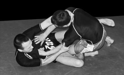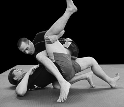 Свип 3. Выполняется, когда ваш противник пытается встать на ноги и поднимает одно колено. Прихватите изнутри поднятое колено одной рукой и локоть противоположной руки другой рукой и, расцепив гард, выполните противоположной поднятому колену ногой мощное круговое движение глубоко вбок, тем самым выводя своего противника из равновесия (рис. 338, 339). Далее резко оттолкнитесь тазом вверх и, помогая себе руками, выполните переворот, выходя в позицию маунт (рис. 340—342).