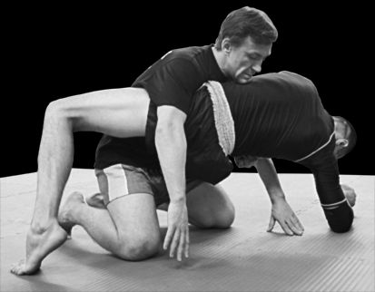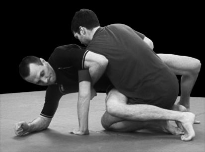 Свип 2. Вы держите гард, с силой притягивая противника за шею к себе, а он жестко упирается вам обеими руками в живот (рис. 334). Сохраняя давление на шею, прихватите его одной рукой за локоть и, расцепив гард, быстро вынесите таз в противоположную сторону, выполнив креветку, и уприте колено в районе солнечного сплетения противника. Распирая, давите коленом от себя, а руками тащите противника на себя (рис. 335). Далее второй ногой выполните мощный подбив ноги противника, одновременно закручивая его руками по часовой стрелке (рис. 336, 337). Все эти действия нужно выполнить достаточно быстро и слитно, чтобы ваш соперник не сумел вам помешать.