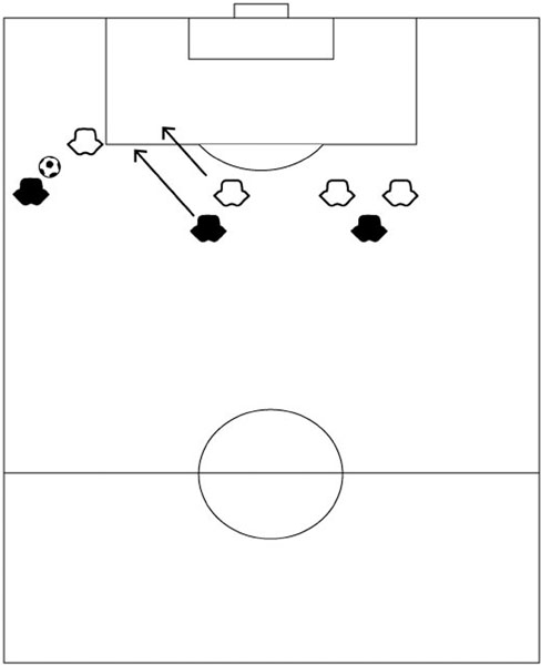 Тренеру на заметку: Некоторые тренеры будут совершенно не согласны со мной по этому вопросу. Пусть так, но я всегда буду рад, если соперник будет делать такие забегания. По моему мнению, они могут атаковать боковой флажок сколько душе угодно. Причина, по которой игроки совершают забегание к задней и боковым линиям, заключается в том, что это самый простой способ получить мяч. Но это также наиболее легкое и наименее опасное действие для защиты. Если в этом вопросе вы на моей стороне, то вот как это поправить. Начертите схему на доске. Затем перенесите ситуацию на поле. Затем кричите на нападающего каждый раз, когда он делает такое забегание.