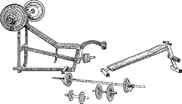 А вот теперь поговорим о развитии мышц подробнее. Вот что советует Вейдер. Для начала надо приобрести (или самому изготовить) очень простой, но полезный спортивный станок, названный им многоцелевой скамьей, и комплект штанг и гантелей.