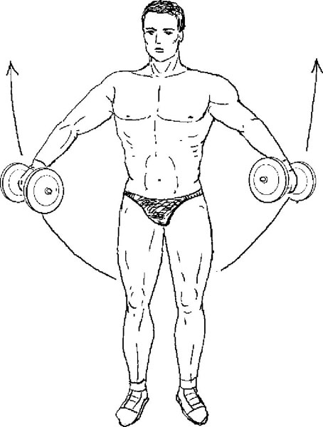 Упражнение 3 комплекса № 1 Вейдера – подъем рук в стороны стоя – более интенсивно прорабатывает дельтовидные мышцы. И времени на упражнение тратится ровно вдвое меньше – потому как для обеих рук сразу.