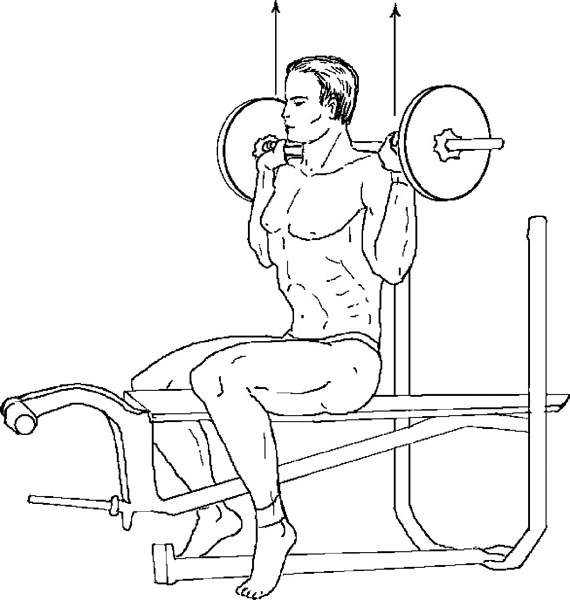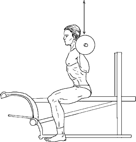 Упражнение 4. Жим из-за головы сидя. Обратите внимание на вертикальную стрелку – поднимать и опускать штангу строго вертикально