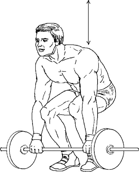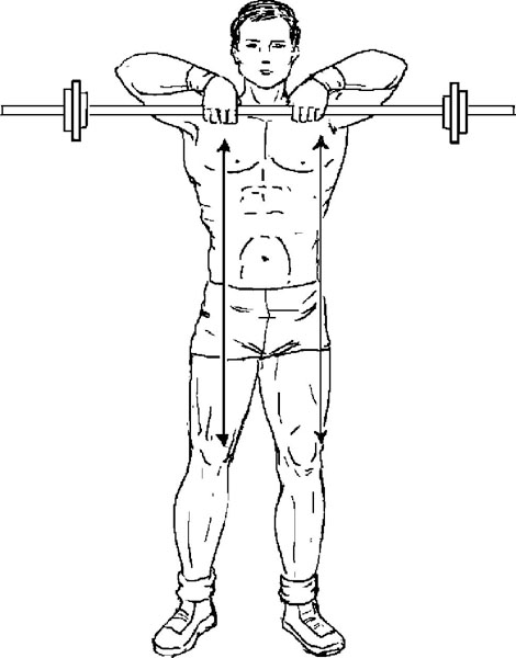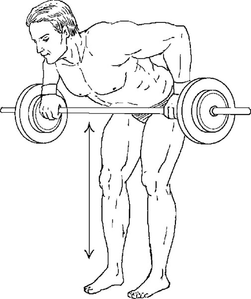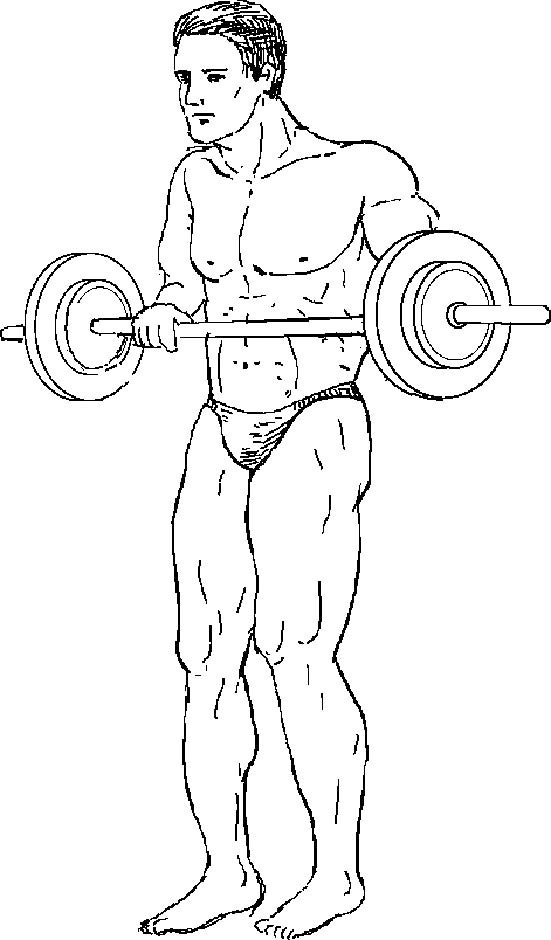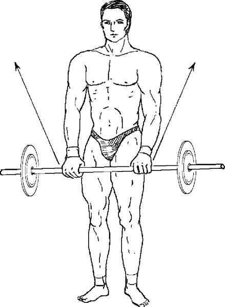 Исходное положение. Стоя, держите штангу хватом сверху в опущенных руках, гриф поперек бедер.