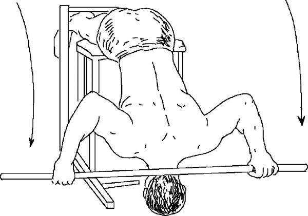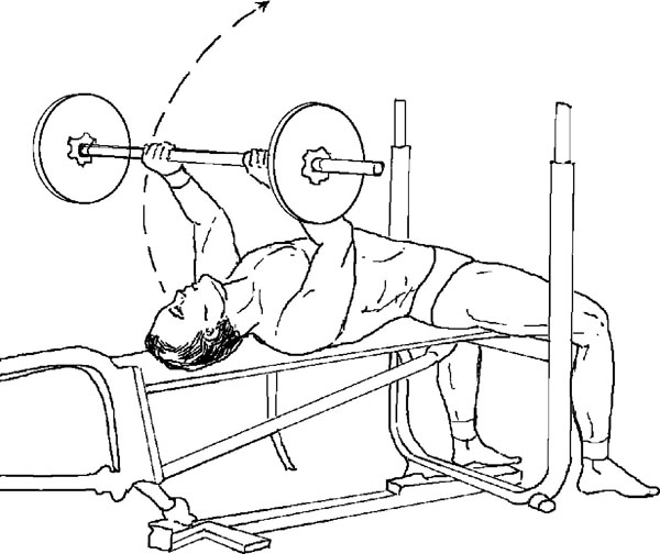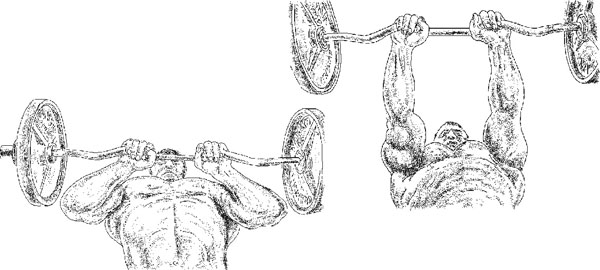 Голова должна быть слегка запрокинута за край скамьи. Это дает свободное место для того, чтобы опустить штангу и как следует потянуть трицепсы (рис. ниже).