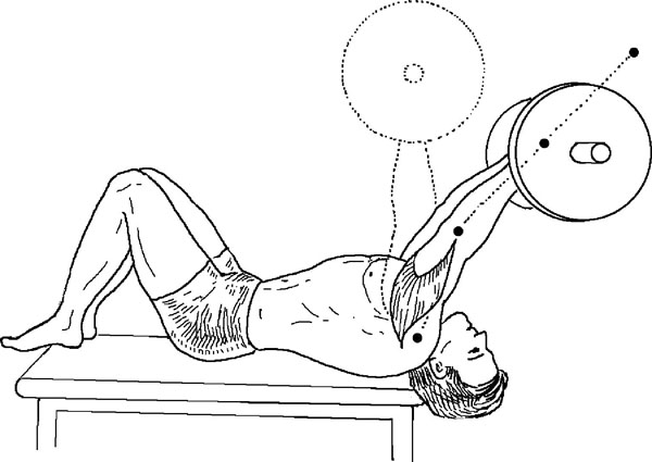10. «Пуловеры» на прямых руках (штанга). «Руки примерно на ширине плеч. Во время всего упражнения руки остаются прямыми». Аналог – упражнение 3 из комплекса № 2 Вейдера, но Вейдер советует сгибать руки в локтях.