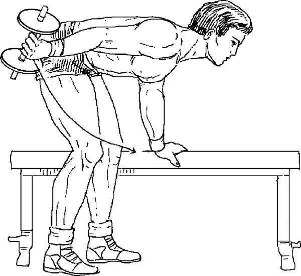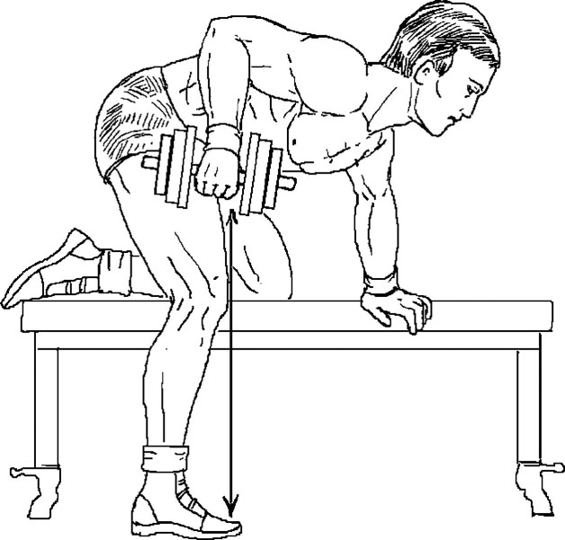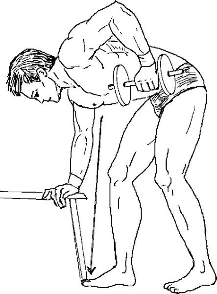 12. Тяга одной рукой (гантели). Описание этого упражнения у Ривза: «Тяните гантель к поясу, сохраняя единый наклон тела во время всего упражнения». Это упражнение очень похоже на упражнение 2 из комплекса № 2 Вейдера, с той лишь разницей, что Вейдер предписывает опираться о скамью не только рукой, но и одноименным коленом. То есть у Вейдера целенаправленно прорабатываюся мышцы верхней части спины, особенно широчайшие, а также сгибатели рук, особенно бицепсы. А у Ривза появляется возможность читинга скручиванием корпуса или небольшим сгибанием ног в начальной точке и их разгибанием в конечной. И единый наклон тела в такой свободной позиции сложно сохранять во время выполнения упражнения.