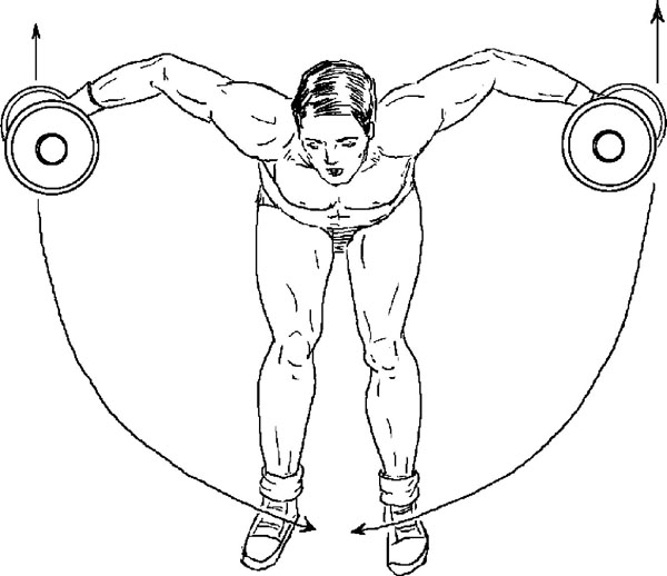 5. Разведения рук в наклоне (гантели). Упражнение 6 из комплекса № 2 Вейдера, как говорится, один к одному. Как советует его выполнять Ривз: «Наклонившись разводите гантели в стороны до тех пор, пока они не будут параллельны полу, затем задержитесь в верхней точке и плавно начинайте движение обратно». У Вейдера нет замечаний относительно ритма, но при описании других упражнений, сходных с этим, рекомендации относительно плавности и изометрической задержки в определенных фазах есть.